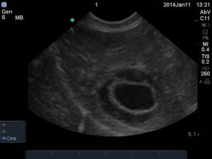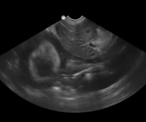 The sonographic finding of the gallbladder halo sign has been reported to be helpful as a marker for anaphylaxis (AX) in dogs since their shock organ (where most mast cells reside) is their liver and gastro-intestinal tract (unlike humans and cats that have the lungs as their shock organ). The massive histamine release causes acute hepatic congestion due to constriction of hepatic venous outflow (Quantz, JVECC 2009). Of course, other signs are helpful for the diagnosis of AX including acute gastrointestinal signs (vomiting and defecating) with collapse, an elevated lactate, an elevated alanine transaminase (ALT). and hemoconcentration. The image below shows a massive gallbladder halo sign at the AFAST DH view at triage (within minutes of patient arrival). In the following image, you can clearly see pericardial effusion surrounding the heart as imaged at the DH view. Take our AFAST Course to learn more; link for more information- Learn more about AFAST!